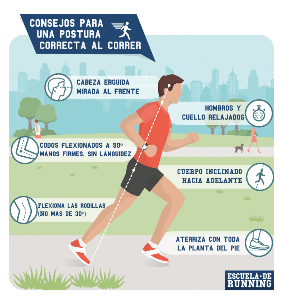 Correr con buena postura te ayudará a correr mejor ya que la mala postura puede ejercer un exceso de tensión en la espalda y las rodillas. Te dejo una imagen de la postura correcta:
